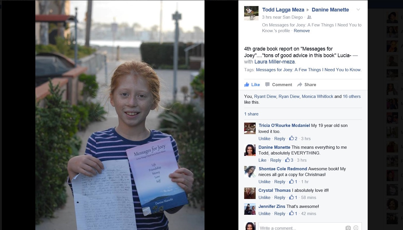 Buyer Beware!!! By: Beatrice Spikes October 10, 2015 Don't read this book thinking it's just a beautiful message from a mother to her daughter. It is SO much more! I have read this book three times and working on my fourth read. This book is for EVERY daughter, mother, niece, cousin, sister and friend regardless of age. I defy anyone to read this book and deny having at least one moment of "Aha!" or "I wish someone had told me that yesterday, last week, last month, 10, 20, 30, 40, or 50 years ago!" or "Isn't that the truth!" If you don't come away with AT LEAST one, you'd simply be lying to yourself. There isn't one "Message" that you wouldn't want that special young lady to know along her path to becoming self-assured, balanced, mentally, emotionally, and financially grounded. But it doesn't stop there. There are nuggets of wisdom in every chapter that will even guide the not-so-young toward greater self-assurance, mental, emotional, and financial balance. If you're in the latter category, get a copy for yourself AND that special young lady. Trust me, you need your own copy. Better yet, get multiple copies because every young lady you care about and love needs your guidance and they need it now. Stop being anxious about when and how to start the conversations or what to say. Read the book together, form a book club, whatever works. Read it with courage because you'll see yourself in the messages contained within the book, and you'll no doubt reflect privately on your own life experiences. If that special young lady is close by, be ready to reinforce the messages and talk about how they have applied to your own life experiences, what they mean to you, and what you want the messages to mean for them. Doing so will really make the advice come alive even more, especially to young readers. If she's not close by, no worries! "Messages" is written in a format that is easy to understand, easy to follow, and hard to put down. It can be read quite effortlessly in one day. Use the blank pages between chapters to add your own personal messages. Manette has done a fantastic job of covering all the bases, though, leaving no stone unturned. So you'll have to think hard to find something she left out. Absolutely a great read and a must read. Enjoy!!! A gift and guide for every female By: Sharmele Browne-Jiles October 5, 2015 I am sure Joey will be grateful. I know I would have and do cherish the messages you have in this book. The fact that the messages are written is immeasurable! Hearing is one thing, but seeing and being able to go back and refer is truly PRICELESS!!! I can't wait to give the books to my 3 nieces for Christmas!!! A touching testament to Danine Manette’s love for her daughter By: S. Simonson October 4, 2015 Messages for Joey, a touching testament to Danine Manette’s love for her daughter, provides valuable guidance that will benefit female readers of all ages as they strive to navigate life’s joys and challenges. Manette succeeds in imparting wisdom about life, friendship, money, love and self in a clear, accessible manner. The book is filled with pithy sayings and practical advice about a range of universally relevant topics, such as job applications and the importance of self-care, which readers will want to revisit again and again. Messages for Joey makes a special gift for daughters and young women because Manette has provided an area to include personalized notes at the end of each chapter. Read this book and then share it with the cherished women in your life! Grab Your Copy ASAP By:Tamika phillips October 2, 2015 Messages for Joey is a must read! It's very comprehensive and supremely uplifting. Since reading this book i've been inspired to write my own novel, and it has definitely given me more motivation towards my future goals. Amazing! By: Mara Tobis September 24, 2015 This book is amazing!! I laughed and cried and was completely inspired. I can’t wait to give this book to my daughters! Loved it. By: Patricia McDaniel August 10, 2015 Perfect book for any parent wanting to give their child some great advice on managing the many ups and downs in life. This book is both outstanding and practical and providential. By: Hellen Sims June 24, 2015 It was a page turner...even though I have covered those steps many times beyond my own offspring. As a former teacher, the longer I taught, the more freely I shared "words of wisdom" with my students. This book should be required reading for juniors and beyond. I absolutely adore it. I know the author has a very vested interest in her own family/daughter, but it will truly benefit every reader. Awesome! By: Todd Laga June 8, 2015 Incredible and perfect! My daughter will always have these awesome insights and lessons to read over and over. So good and relevant for all but especially for girls coming of age in a confusing world. Refreshing and empowering advice! By: Kimberly H Levaux June 6, 2015 We would live in a different world if more children were guided by the messages written on each page of this book! Ms. Manette's loving and common sense advice to her daughter consistently reinforces the ideas of self-empowerment and personal responsibility. Page after page, the message is clear that Joey is in control of the outcome of her life and that it starts with small decisions and actions made day after day. Although this book was written for her young daughter, it easily translates over to sons, sisters, brothers, best friends and other loved ones. It's refreshing to read these pages and know that these values and ideas still hold true in today's world. Please check out this book... By: Mattie St Amant May 23, 2015 My book arrived 2 days ago so today I sat on my patio & read it from cover to cover. It's about a 2 hour read. I must say you did an excellent job. What a wonderful gift for you to give to your daughter and to share with all of us. There was so much in this book that was passed down to me from my mother and that I have p